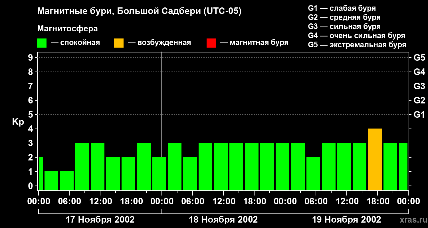 Изменения геомагнитного индекса Kp с 17 по 19 ноября 2002 года для средних широт
