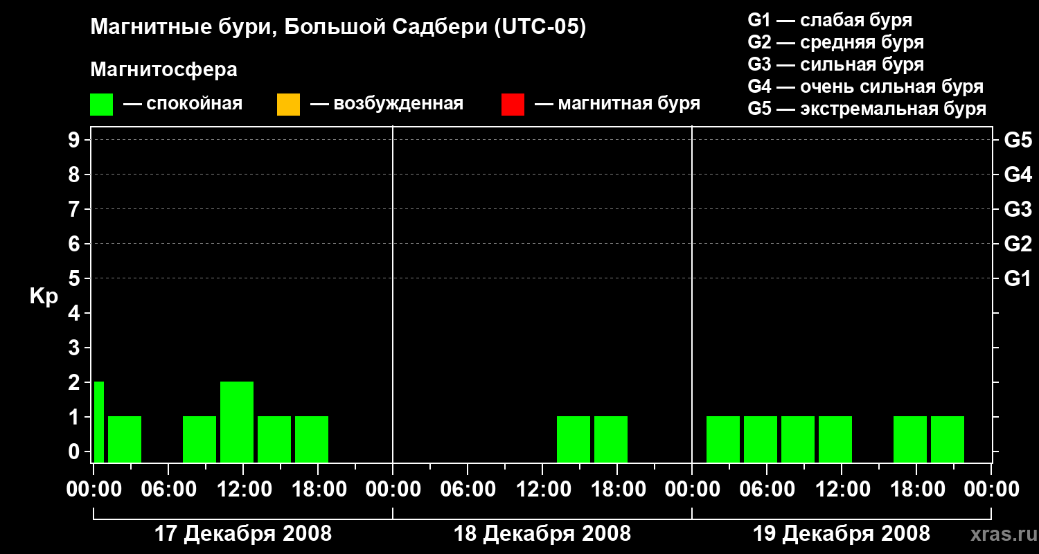 Изменения геомагнитного индекса Kp с 17 по 19 декабря 2008 года для средних широт
