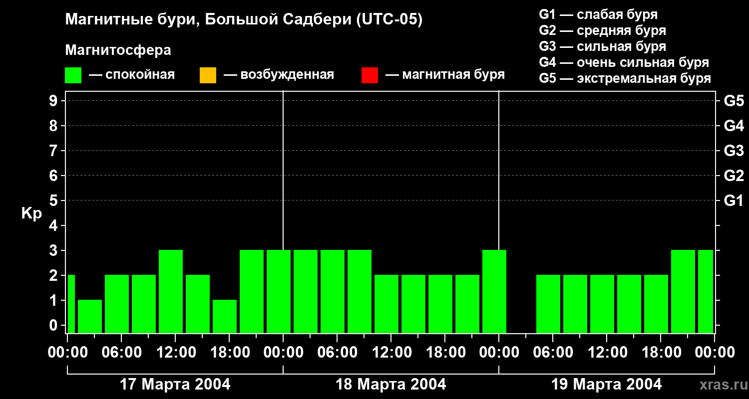 Изменения геомагнитного индекса Kp с 17 по 19 марта 2004 года для средних широт