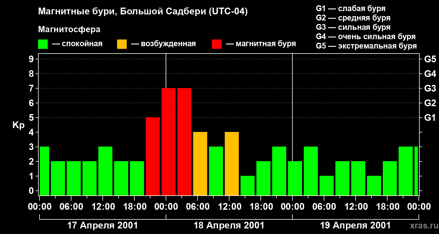Изменения геомагнитного индекса Kp с 17 по 19 апреля 2001 года для средних широт