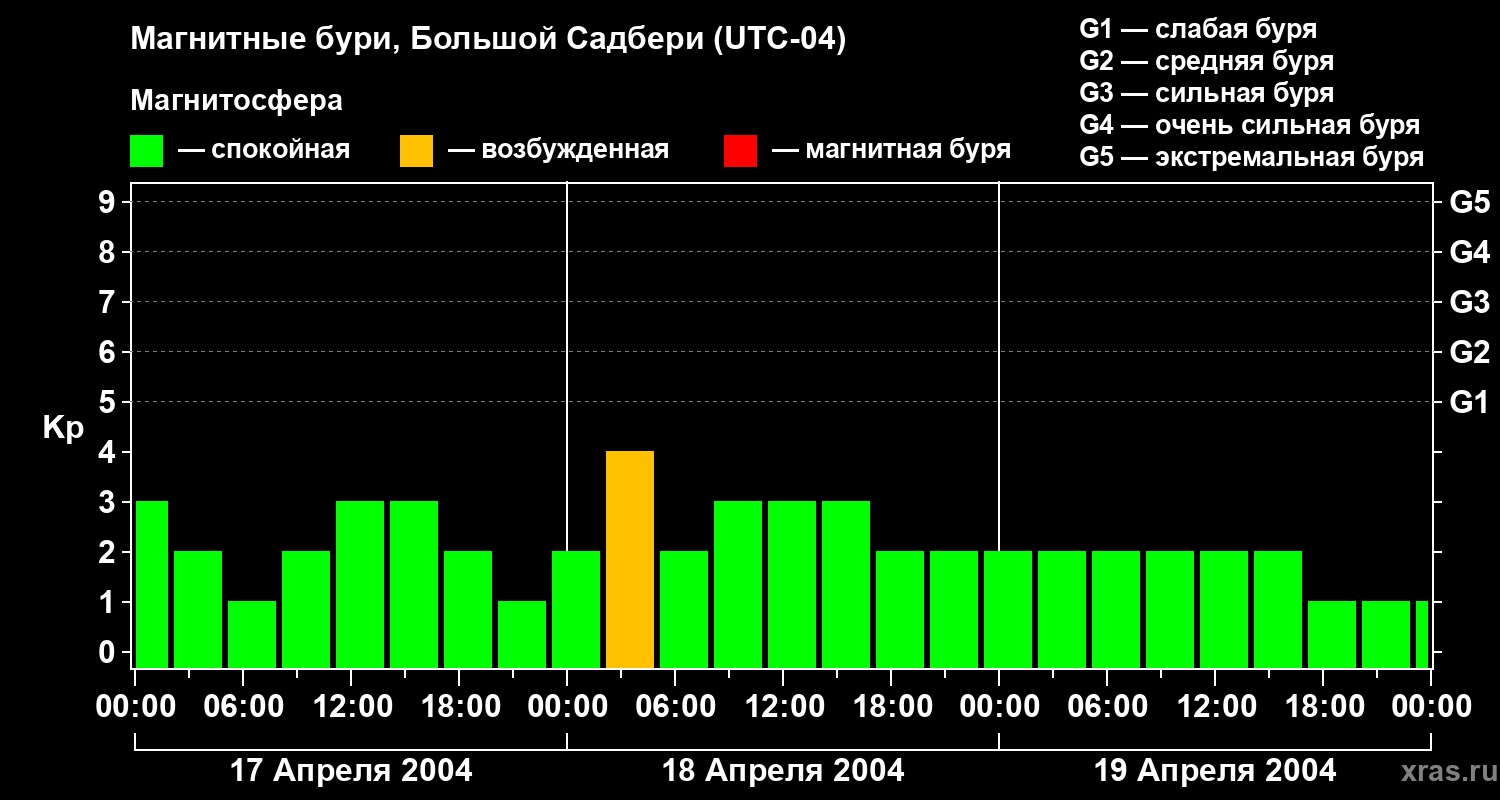 Изменения геомагнитного индекса Kp с 17 по 19 апреля 2004 года для средних широт