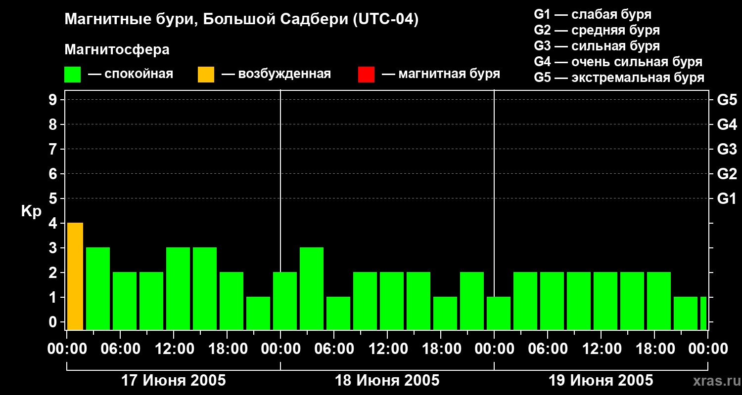 Изменения геомагнитного индекса Kp с 17 по 19 июня 2005 года для средних широт