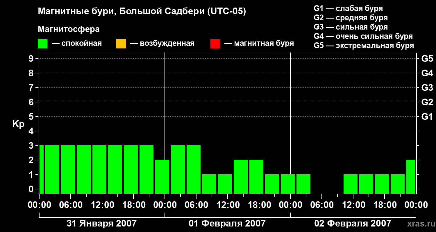 Изменения геомагнитного индекса Kp с 31 января по 2 февраля 2007 года для средних широт
