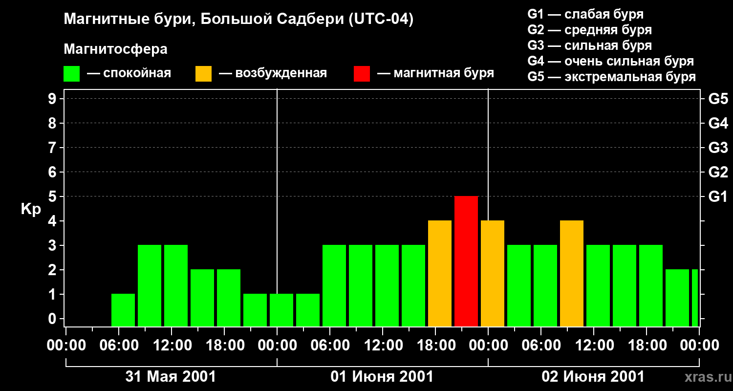 Изменения геомагнитного индекса Kp с 31 мая по 2 июня 2001 года для средних широт