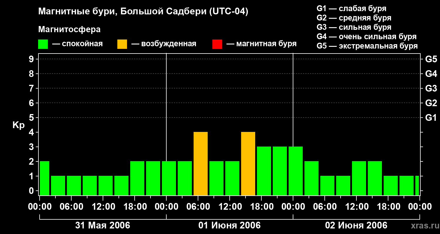 Изменения геомагнитного индекса Kp с 31 мая по 2 июня 2006 года для средних широт