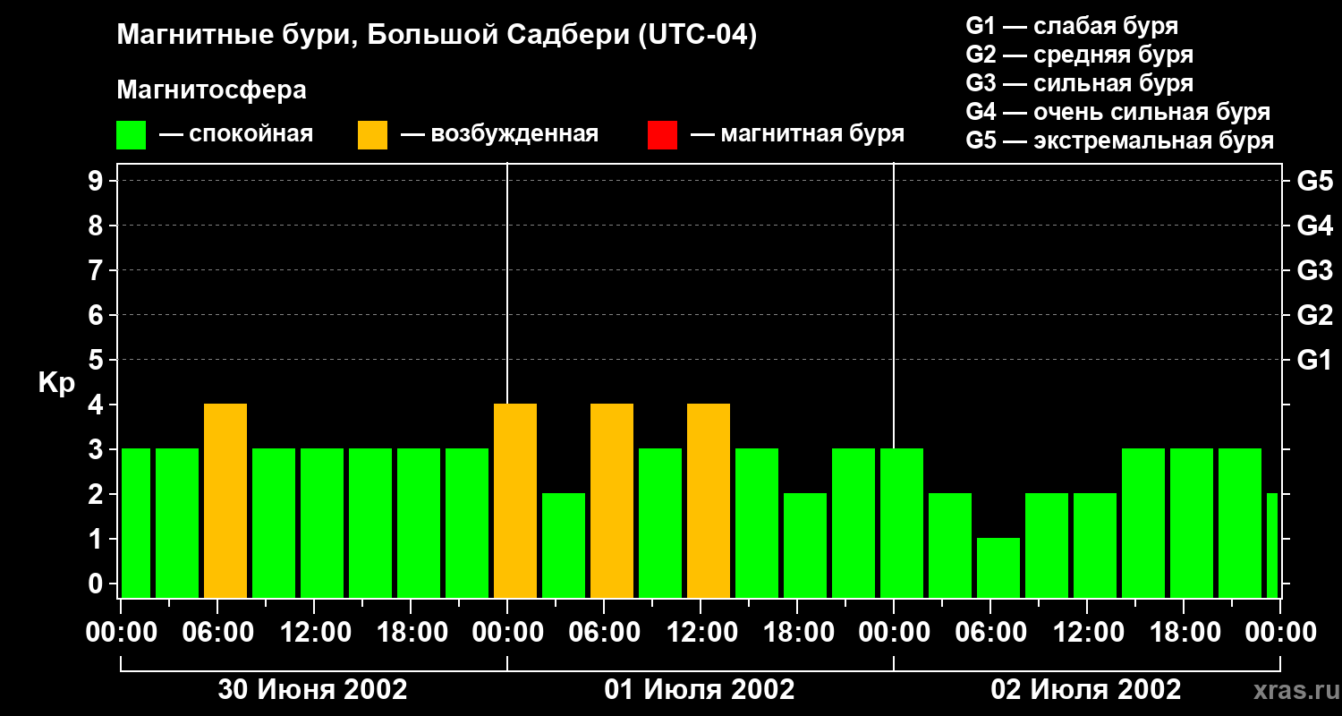 Изменения геомагнитного индекса Kp с 30 июня по 2 июля 2002 года для средних широт