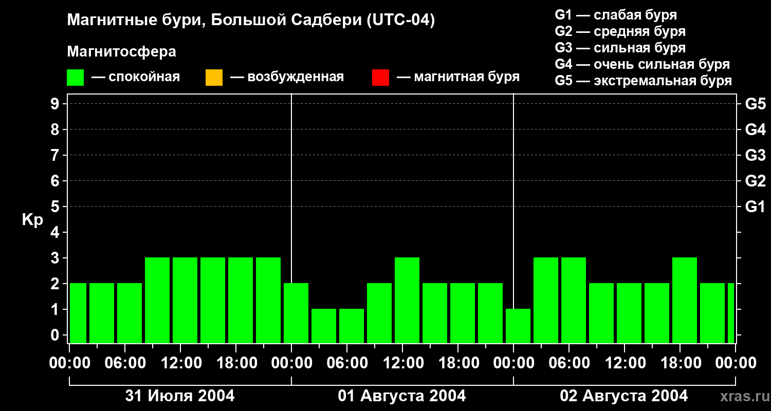 Изменения геомагнитного индекса Kp с 31 июля по 2 августа 2004 года для средних широт