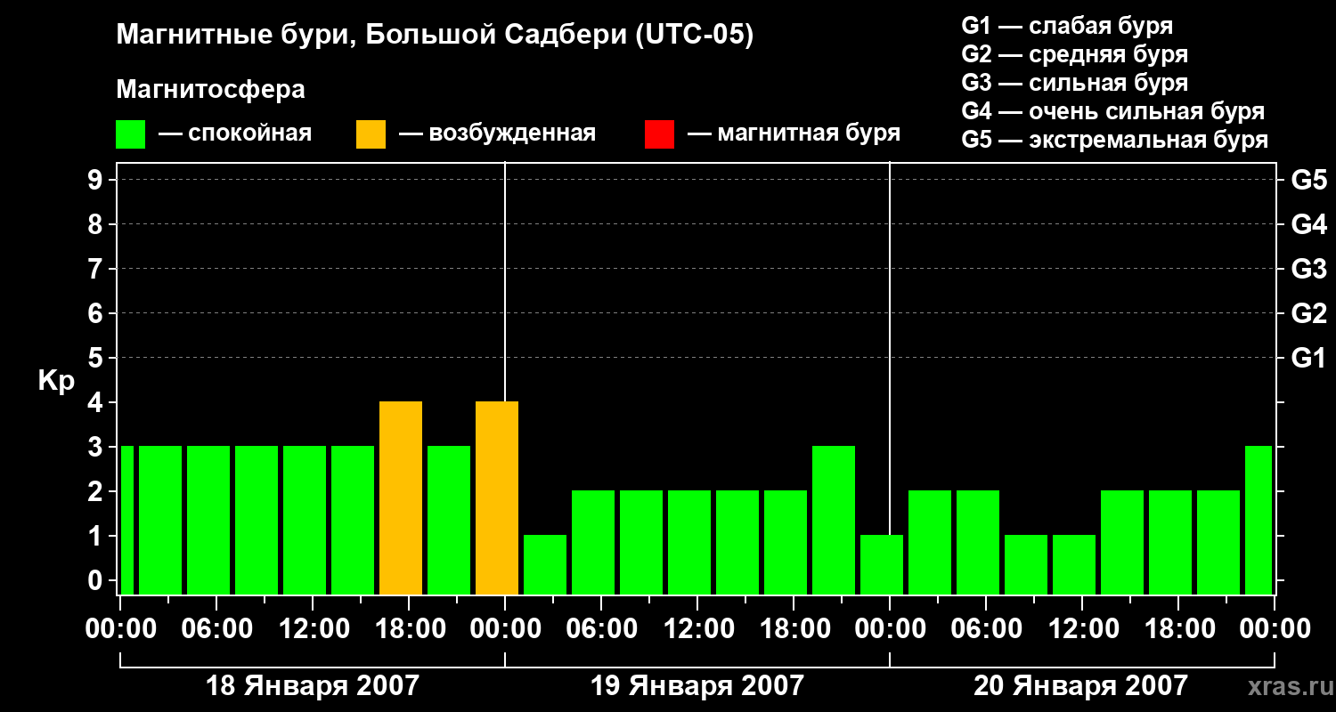 Изменения геомагнитного индекса Kp с 18 по 20 января 2007 года для средних широт