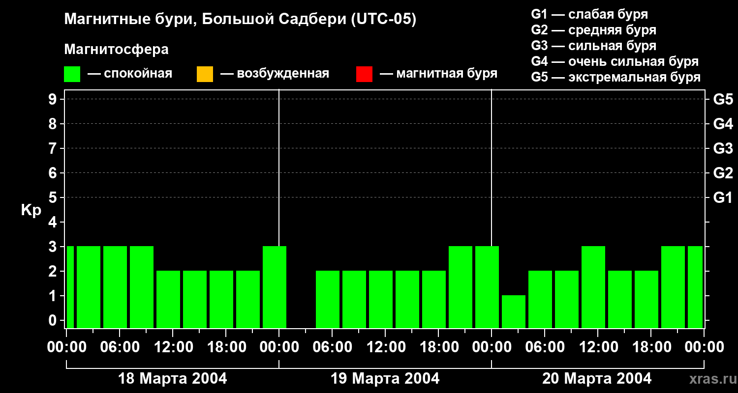 Изменения геомагнитного индекса Kp с 18 по 20 марта 2004 года для средних широт