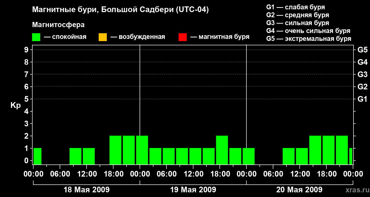Изменения геомагнитного индекса Kp с 18 по 20 мая 2009 года для средних широт