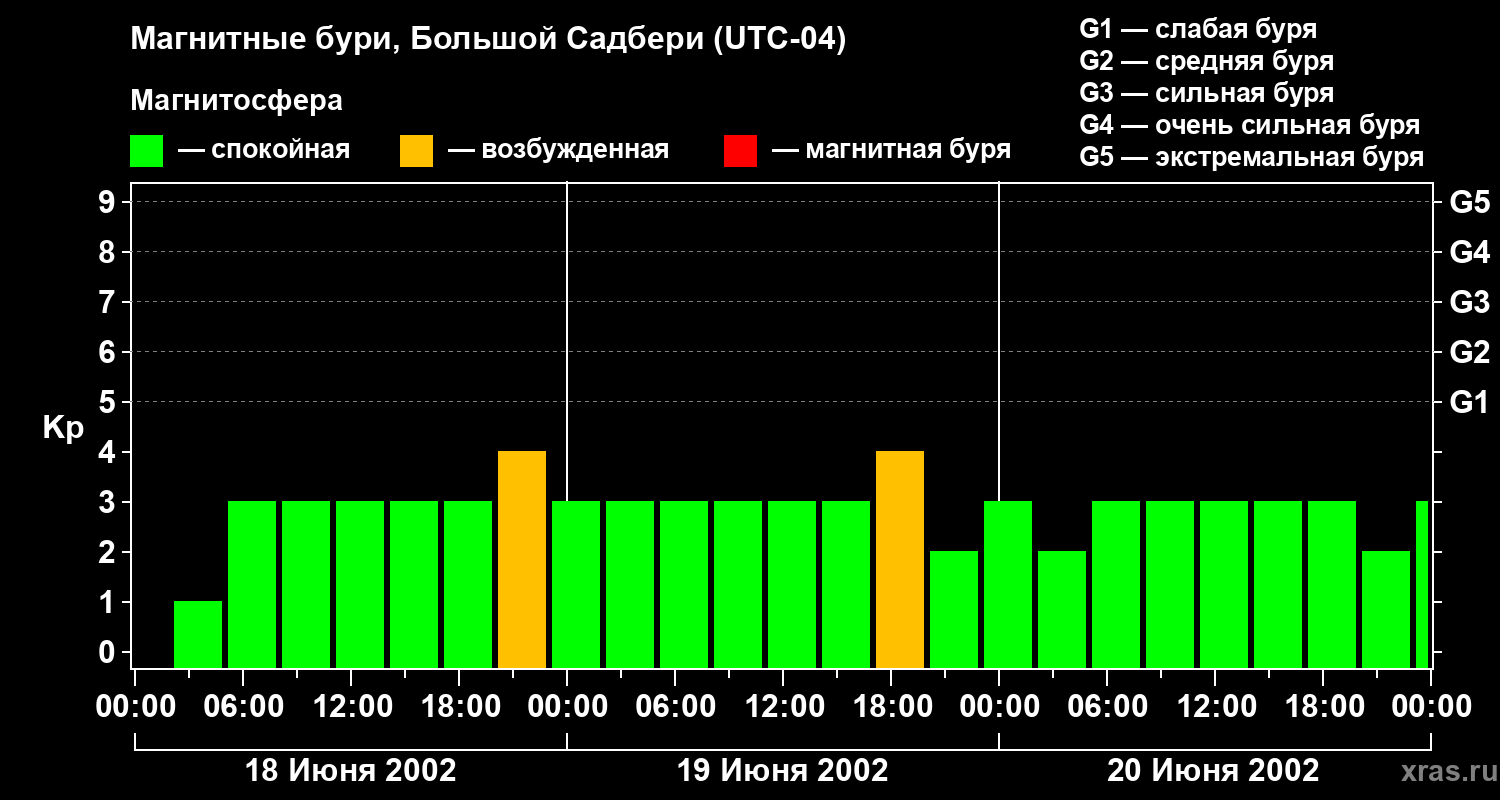 Изменения геомагнитного индекса Kp с 18 по 20 июня 2002 года для средних широт