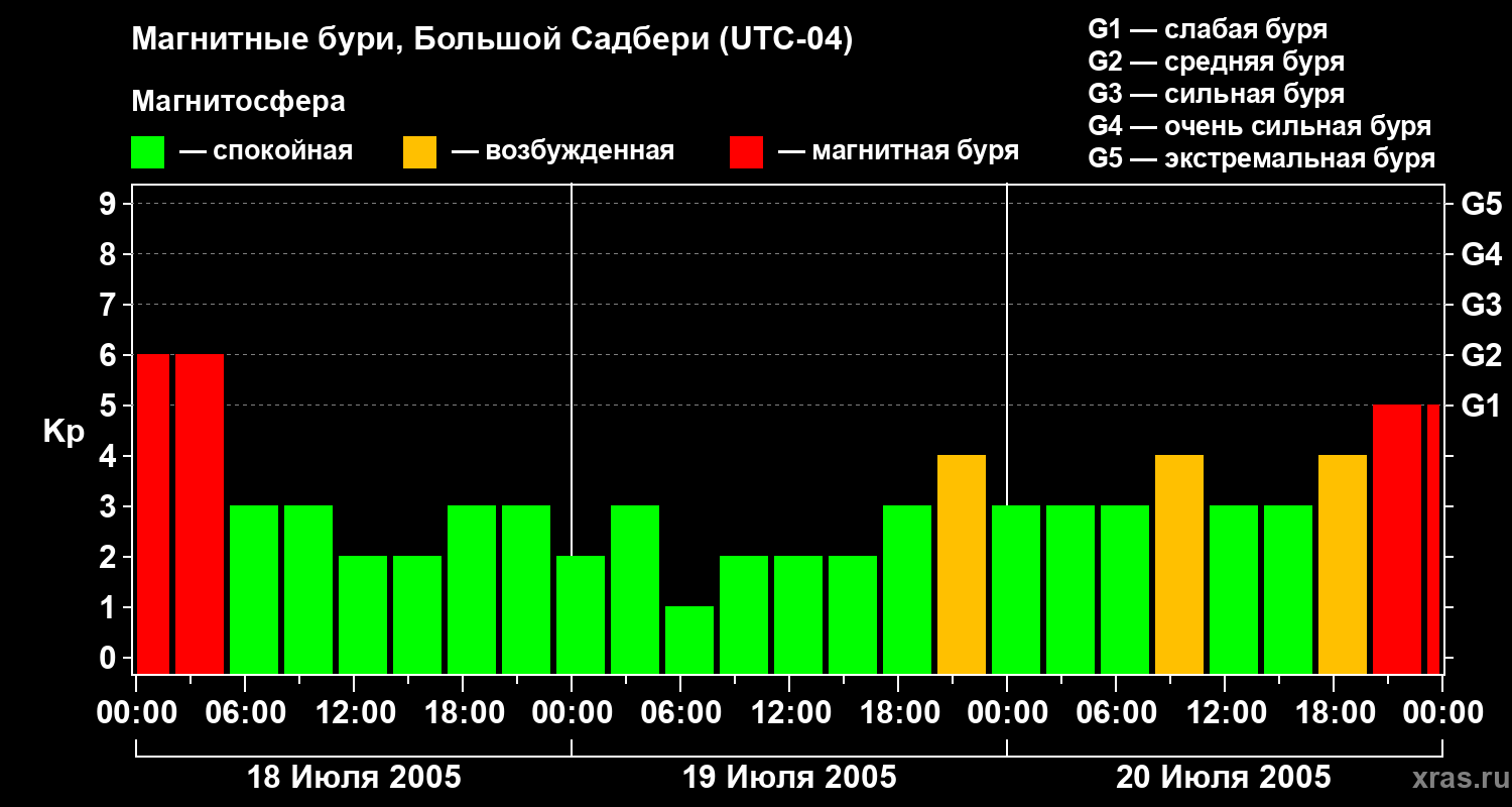 Изменения геомагнитного индекса Kp с 18 по 20 июля 2005 года для средних широт
