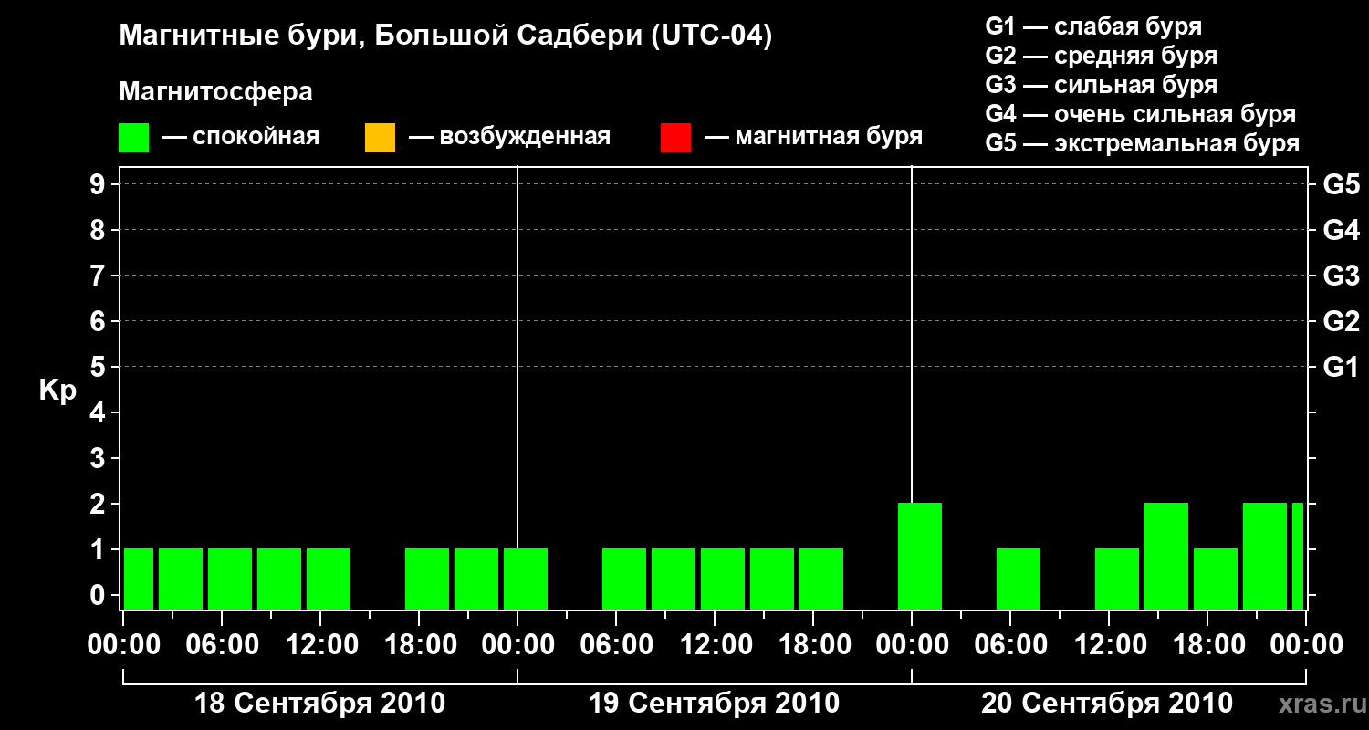 Изменения геомагнитного индекса Kp с 18 по 20 сентября 2010 года для средних широт