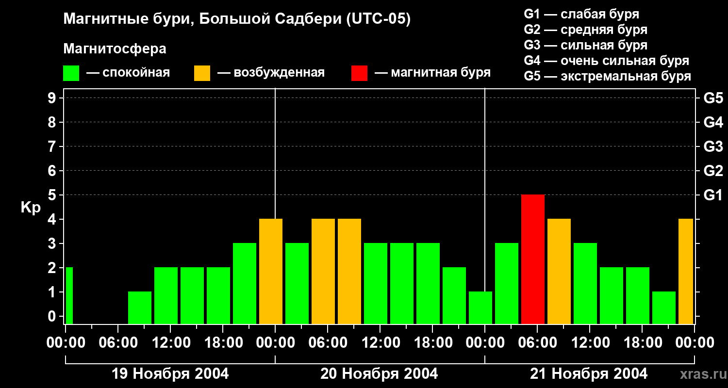 Изменения геомагнитного индекса Kp с 19 по 21 ноября 2004 года для средних широт