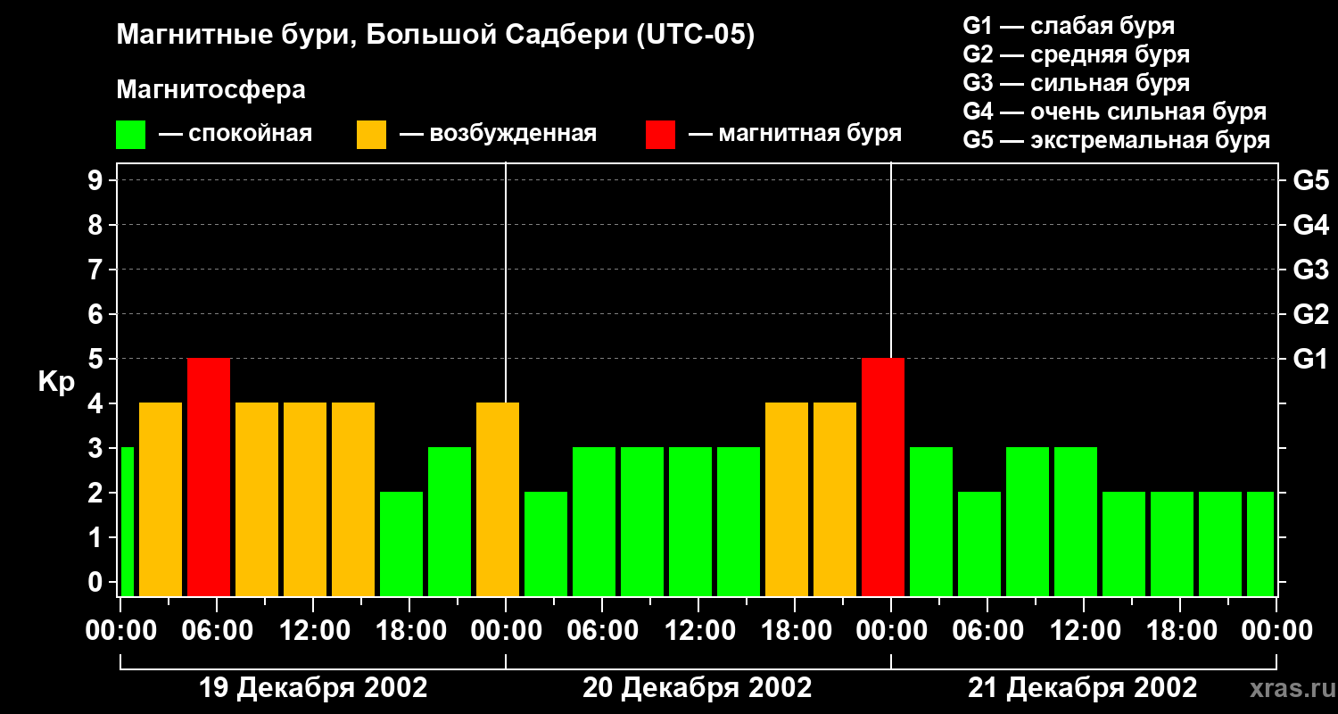 Изменения геомагнитного индекса Kp с 19 по 21 декабря 2002 года для средних широт