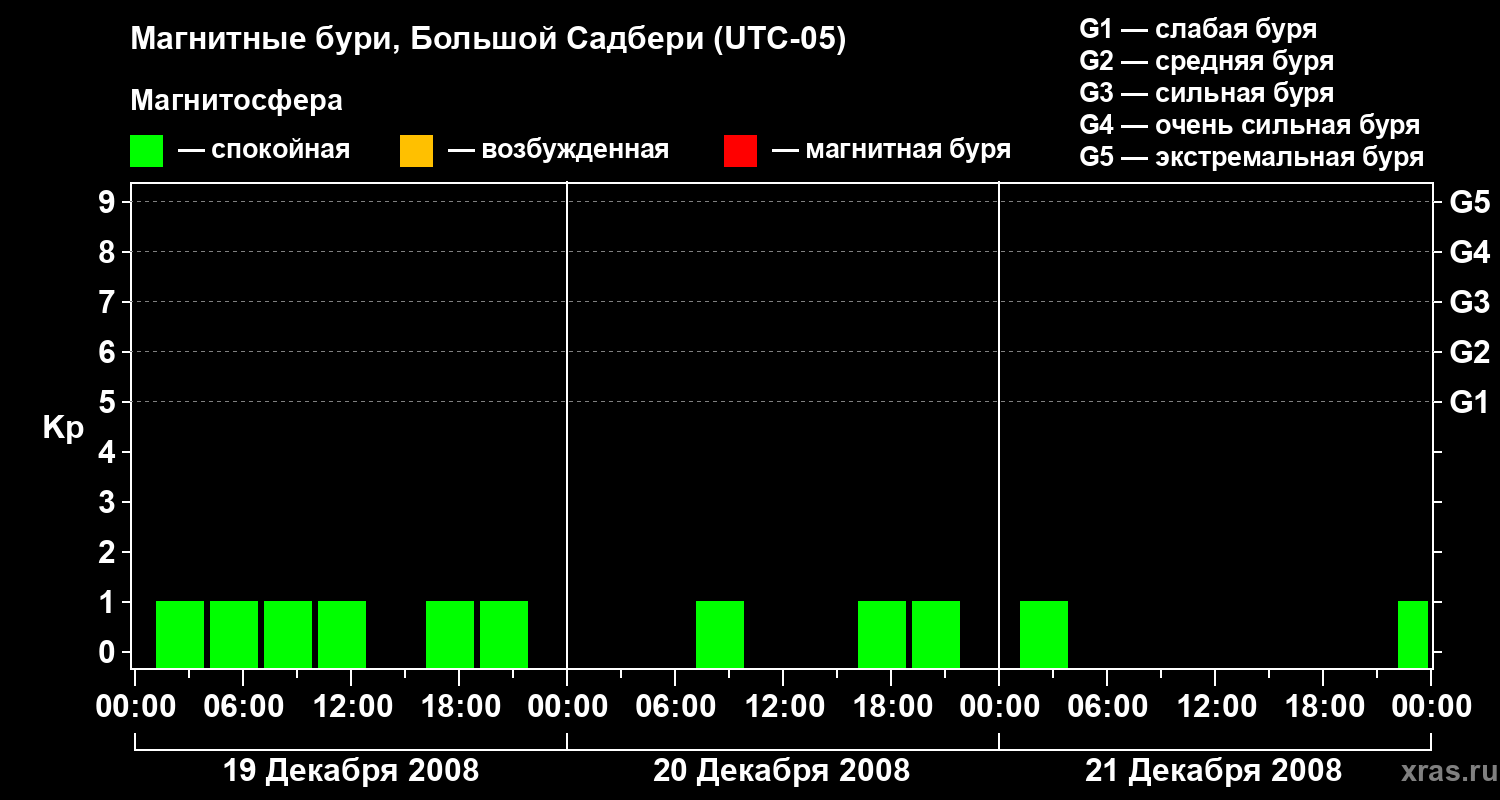 Изменения геомагнитного индекса Kp с 19 по 21 декабря 2008 года для средних широт