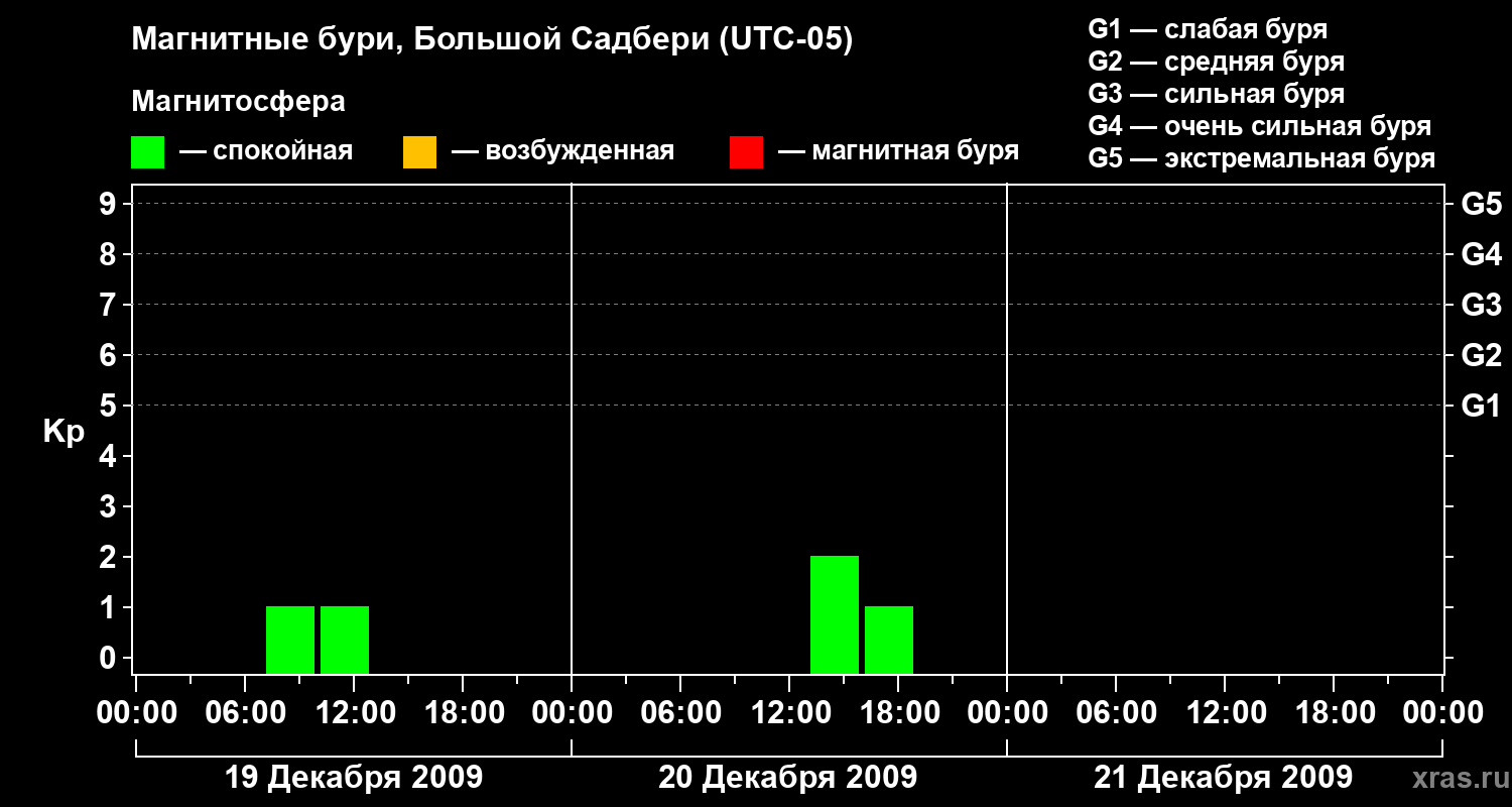 Изменения геомагнитного индекса Kp с 19 по 21 декабря 2009 года для средних широт