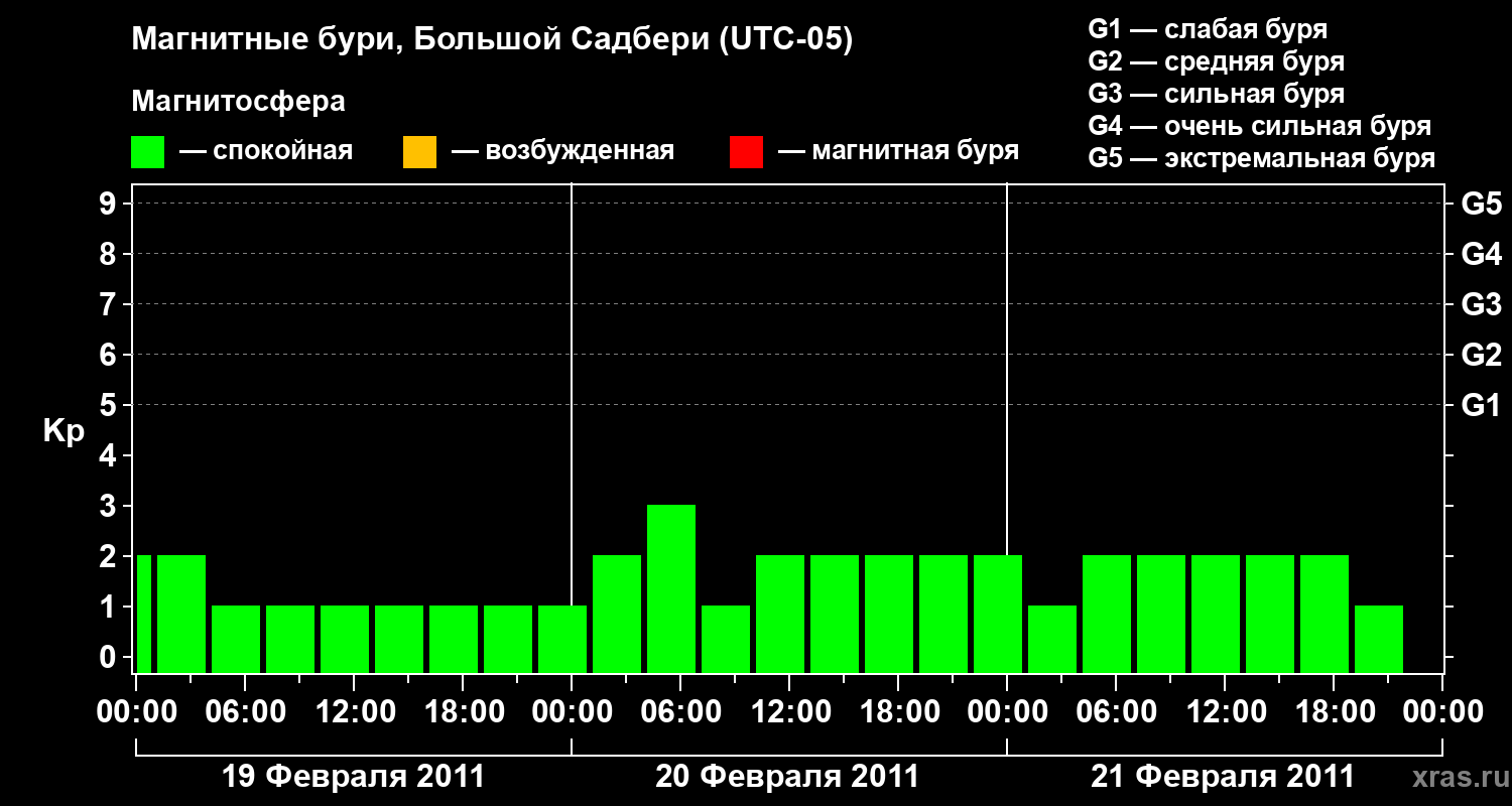 Изменения геомагнитного индекса Kp с 19 по 21 февраля 2011 года для средних широт