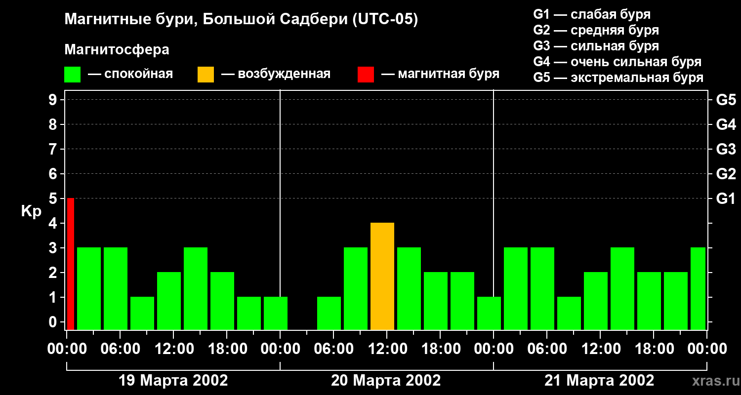 Изменения геомагнитного индекса Kp с 19 по 21 марта 2002 года для средних широт