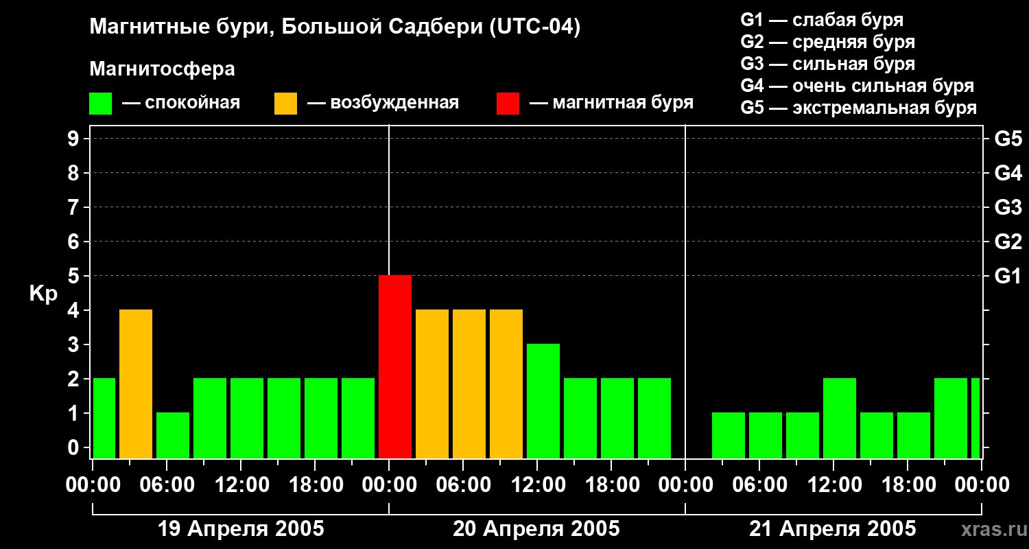 Изменения геомагнитного индекса Kp с 19 по 21 апреля 2005 года для средних широт