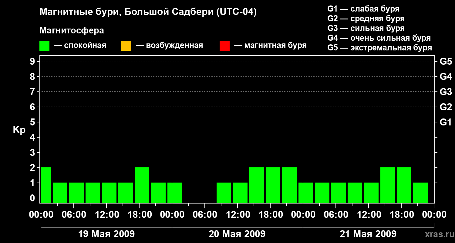 Изменения геомагнитного индекса Kp с 19 по 21 мая 2009 года для средних широт
