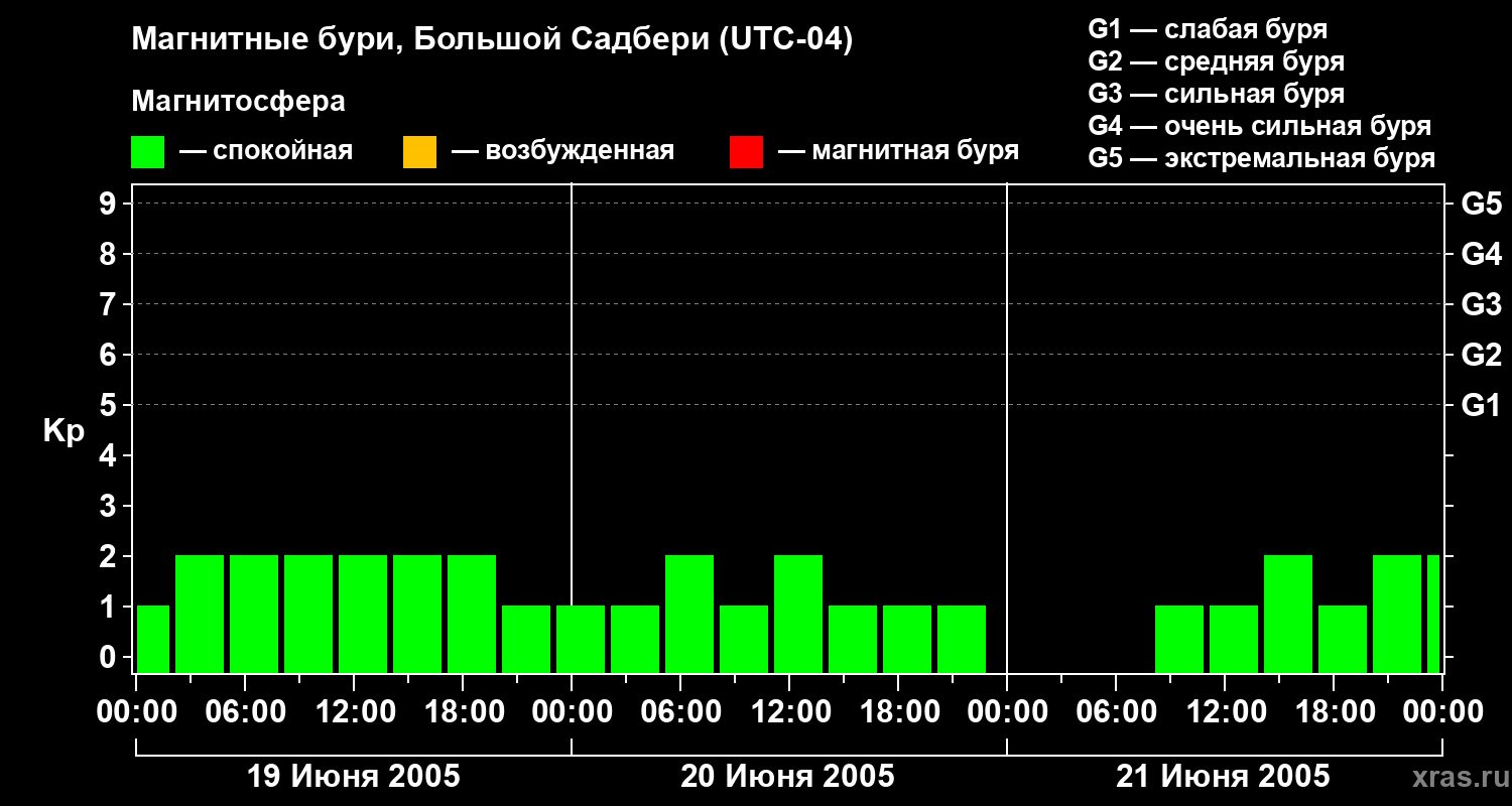 Изменения геомагнитного индекса Kp с 19 по 21 июня 2005 года для средних широт