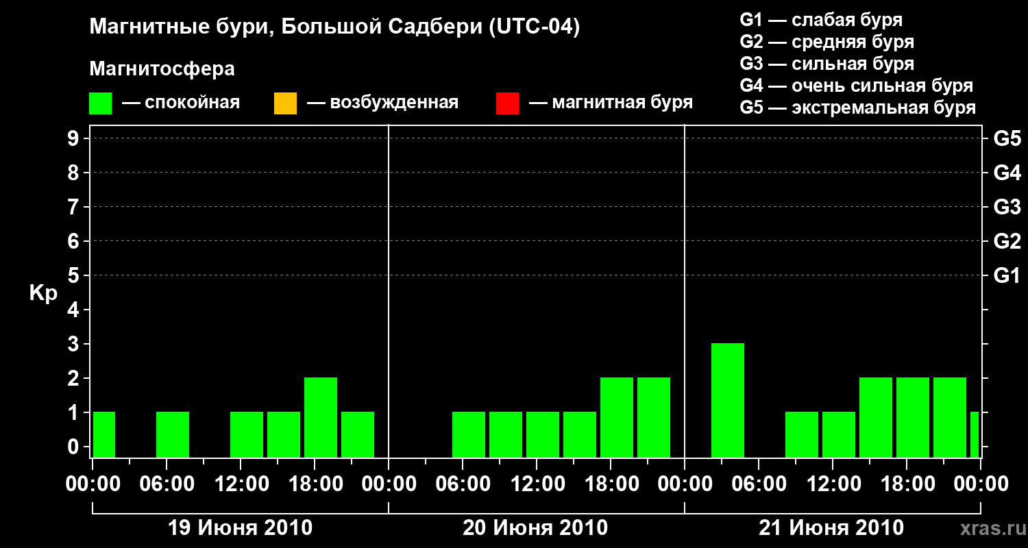 Изменения геомагнитного индекса Kp с 19 по 21 июня 2010 года для средних широт
