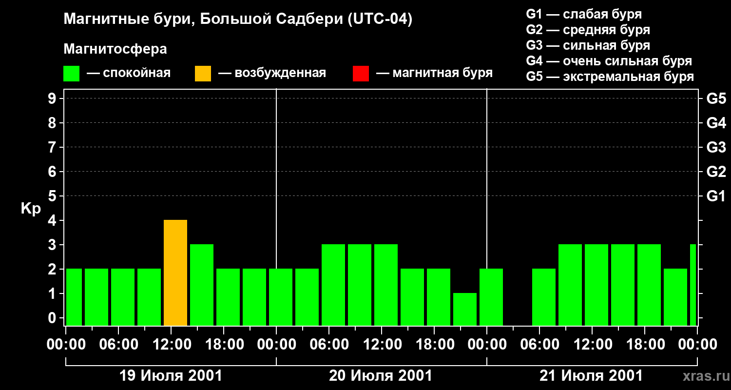 Изменения геомагнитного индекса Kp с 19 по 21 июля 2001 года для средних широт