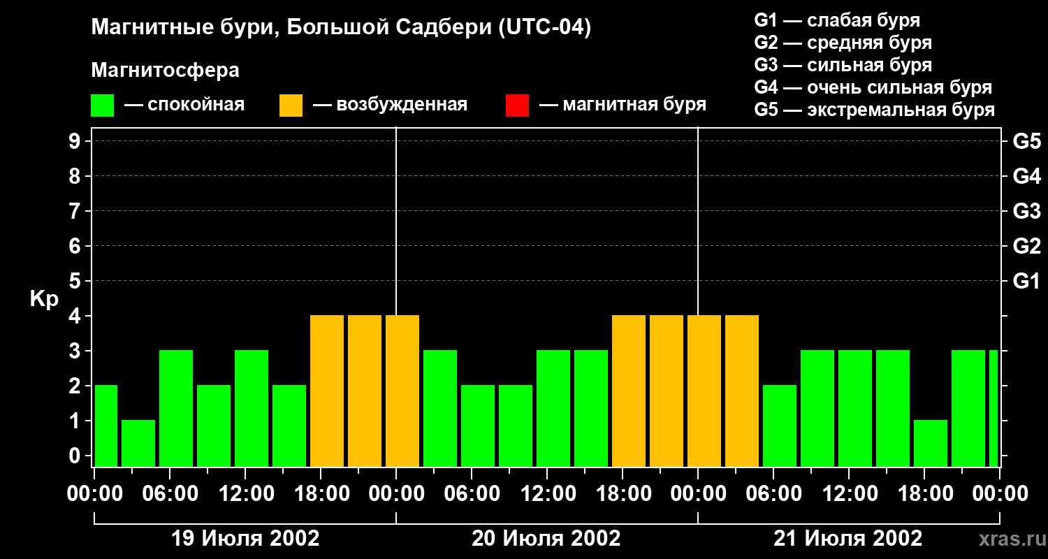 Изменения геомагнитного индекса Kp с 19 по 21 июля 2002 года для средних широт
