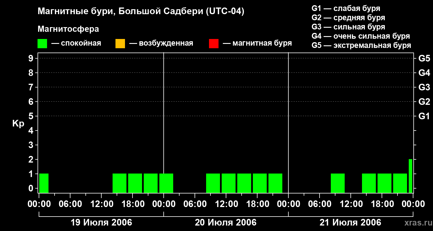 Изменения геомагнитного индекса Kp с 19 по 21 июля 2006 года для средних широт