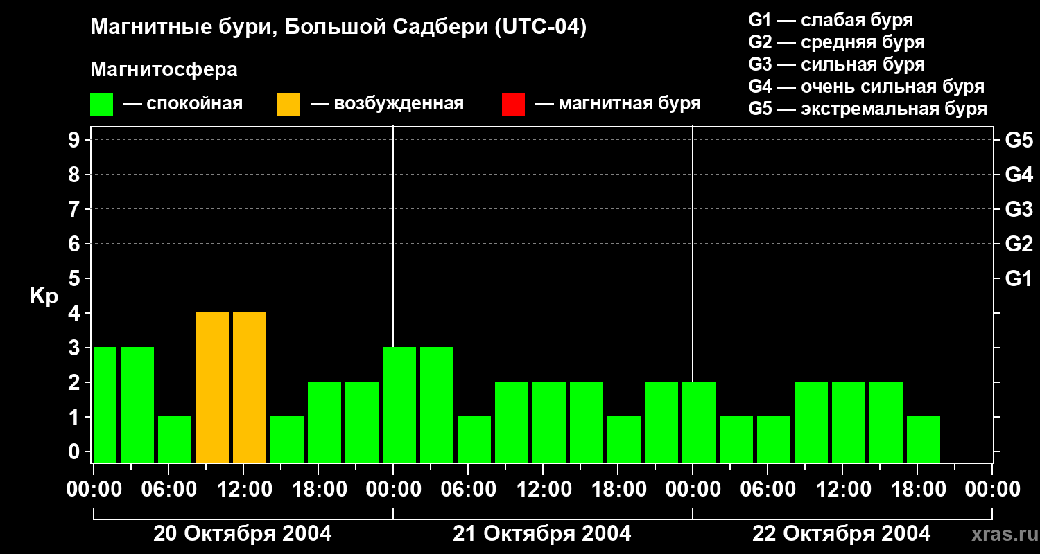 Изменения геомагнитного индекса Kp с 20 по 22 октября 2004 года для средних широт