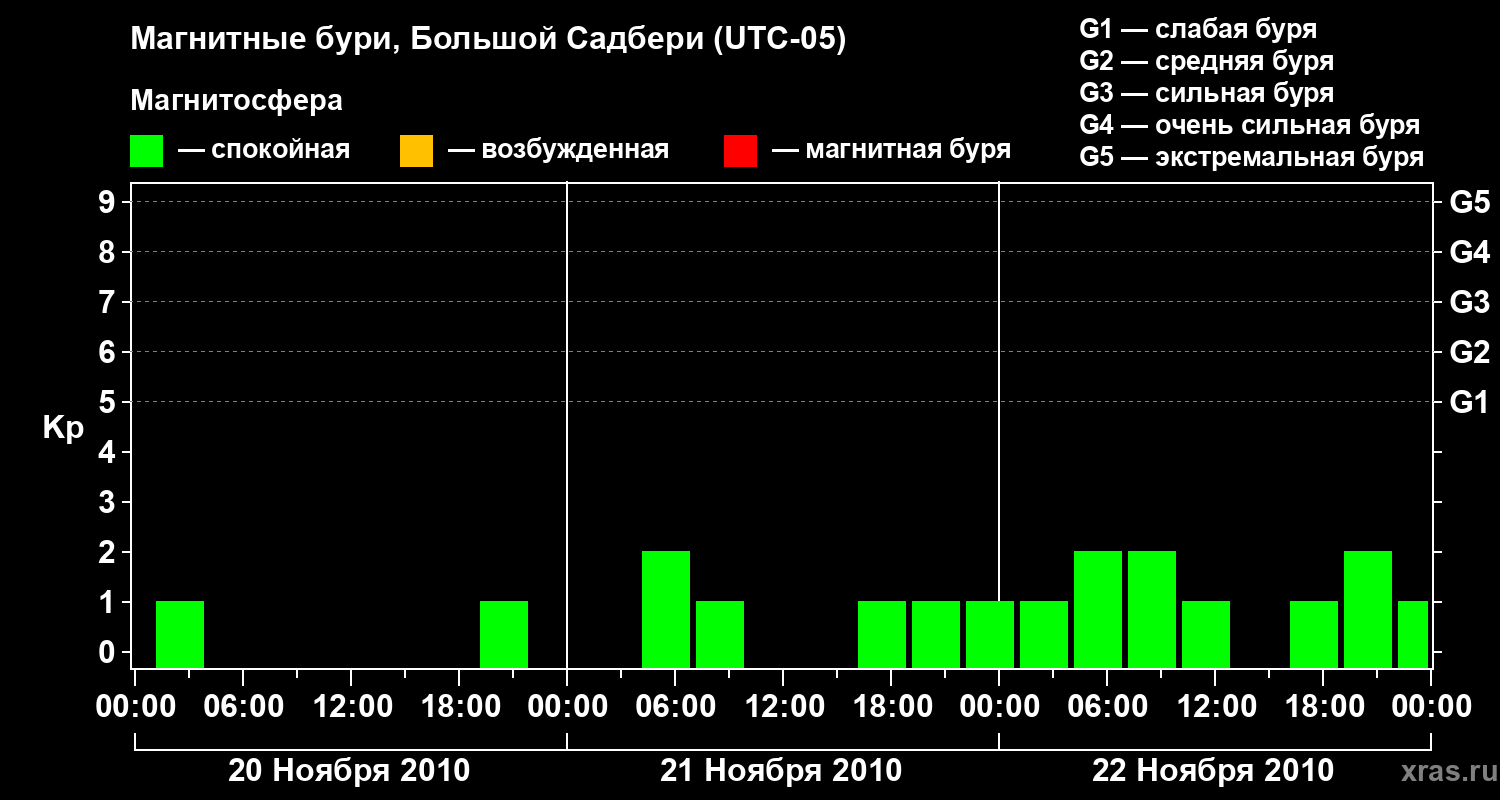 Изменения геомагнитного индекса Kp с 20 по 22 ноября 2010 года для средних широт
