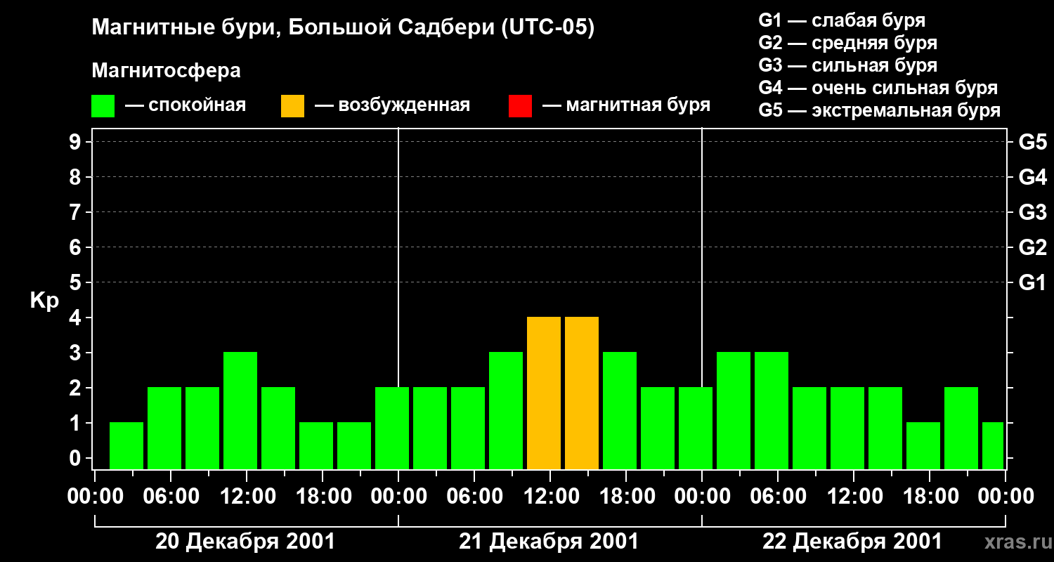 Изменения геомагнитного индекса Kp с 20 по 22 декабря 2001 года для средних широт