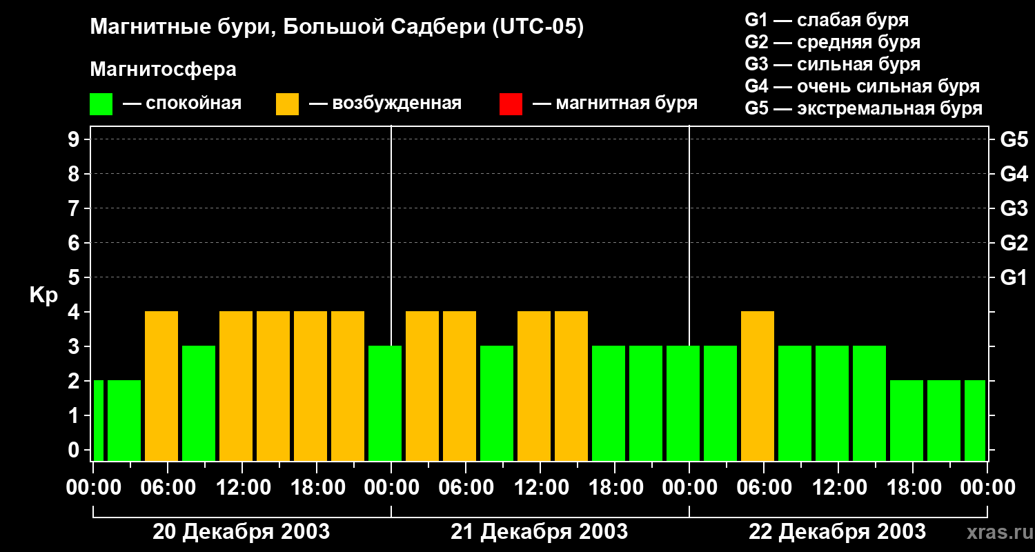 Изменения геомагнитного индекса Kp с 20 по 22 декабря 2003 года для средних широт