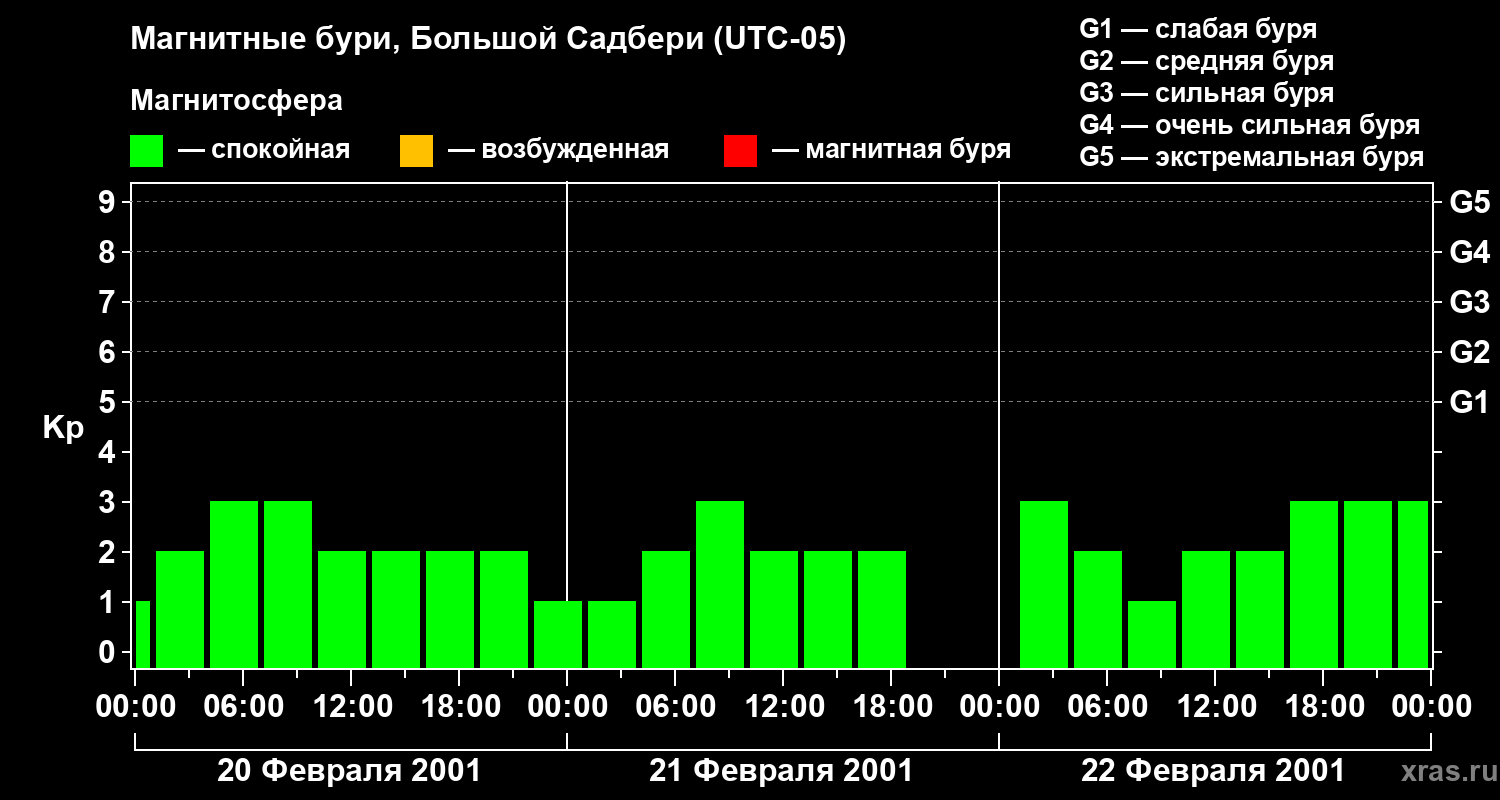 Изменения геомагнитного индекса Kp с 20 по 22 февраля 2001 года для средних широт