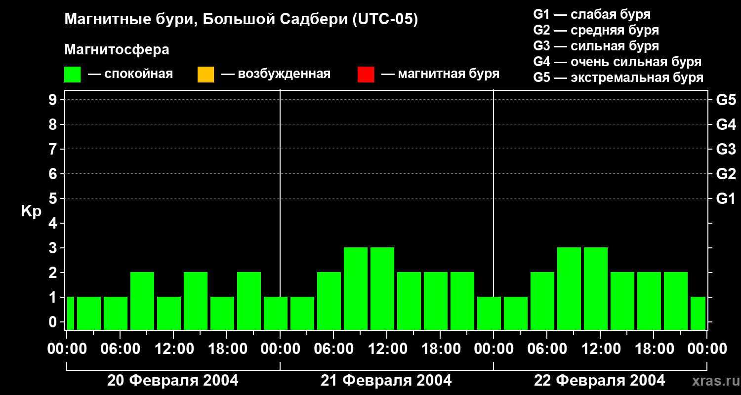 Изменения геомагнитного индекса Kp с 20 по 22 февраля 2004 года для средних широт