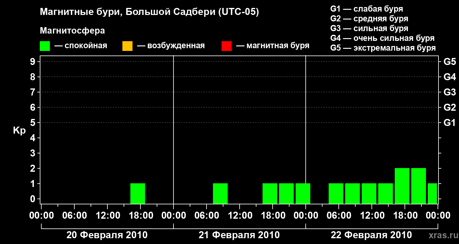 Изменения геомагнитного индекса Kp с 20 по 22 февраля 2010 года для средних широт