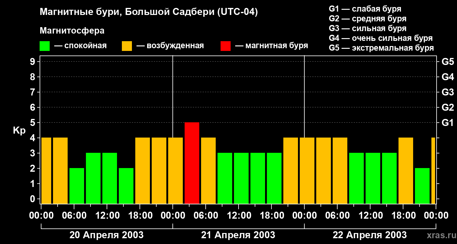 Изменения геомагнитного индекса Kp с 20 по 22 апреля 2003 года для средних широт
