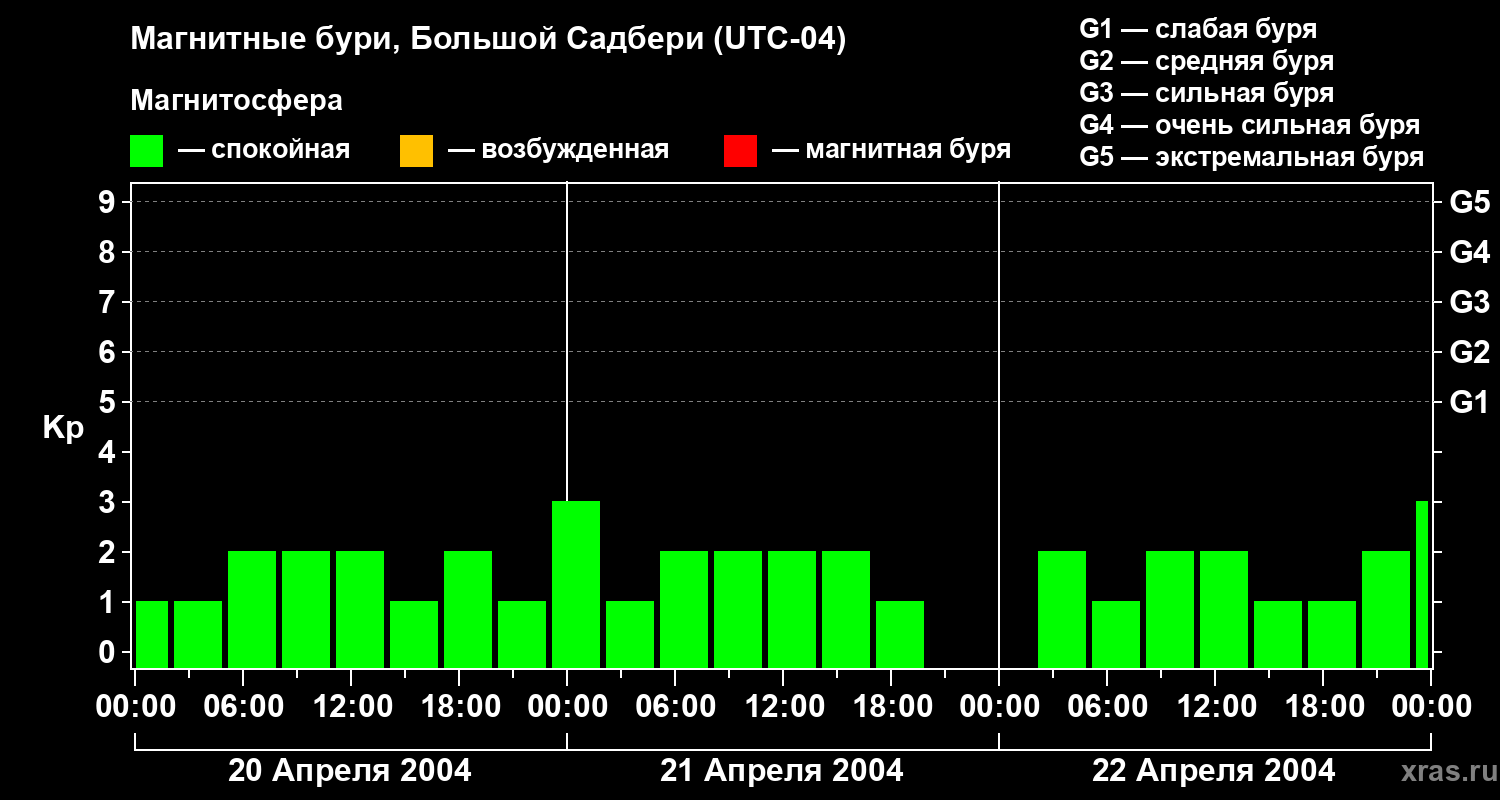 Изменения геомагнитного индекса Kp с 20 по 22 апреля 2004 года для средних широт