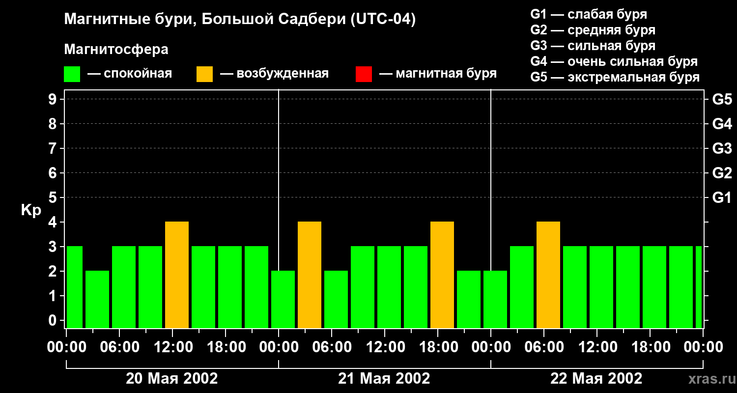 Изменения геомагнитного индекса Kp с 20 по 22 мая 2002 года для средних широт