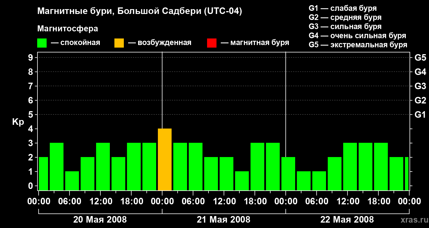 Изменения геомагнитного индекса Kp с 20 по 22 мая 2008 года для средних широт