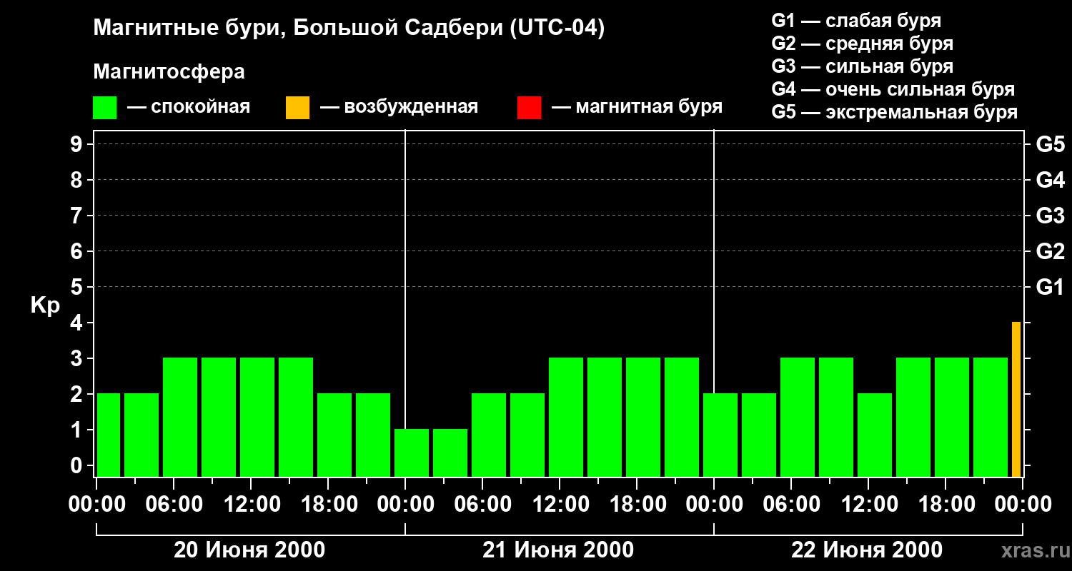 Изменения геомагнитного индекса Kp с 20 по 22 июня 2000 года для средних широт