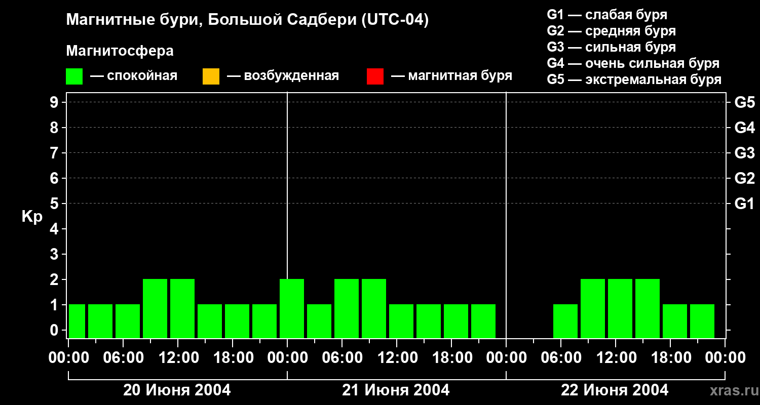 Изменения геомагнитного индекса Kp с 20 по 22 июня 2004 года для средних широт