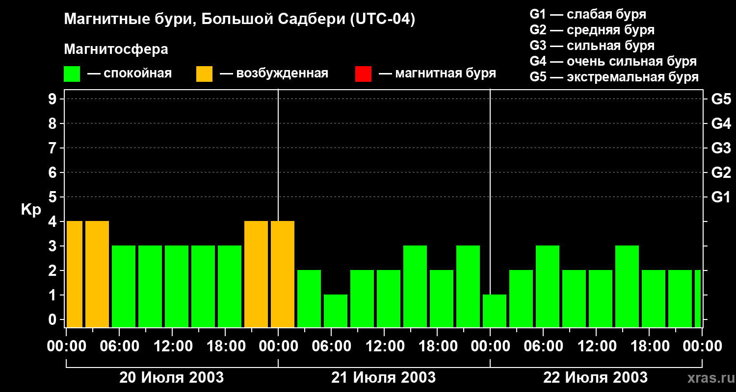 Изменения геомагнитного индекса Kp с 20 по 22 июля 2003 года для средних широт