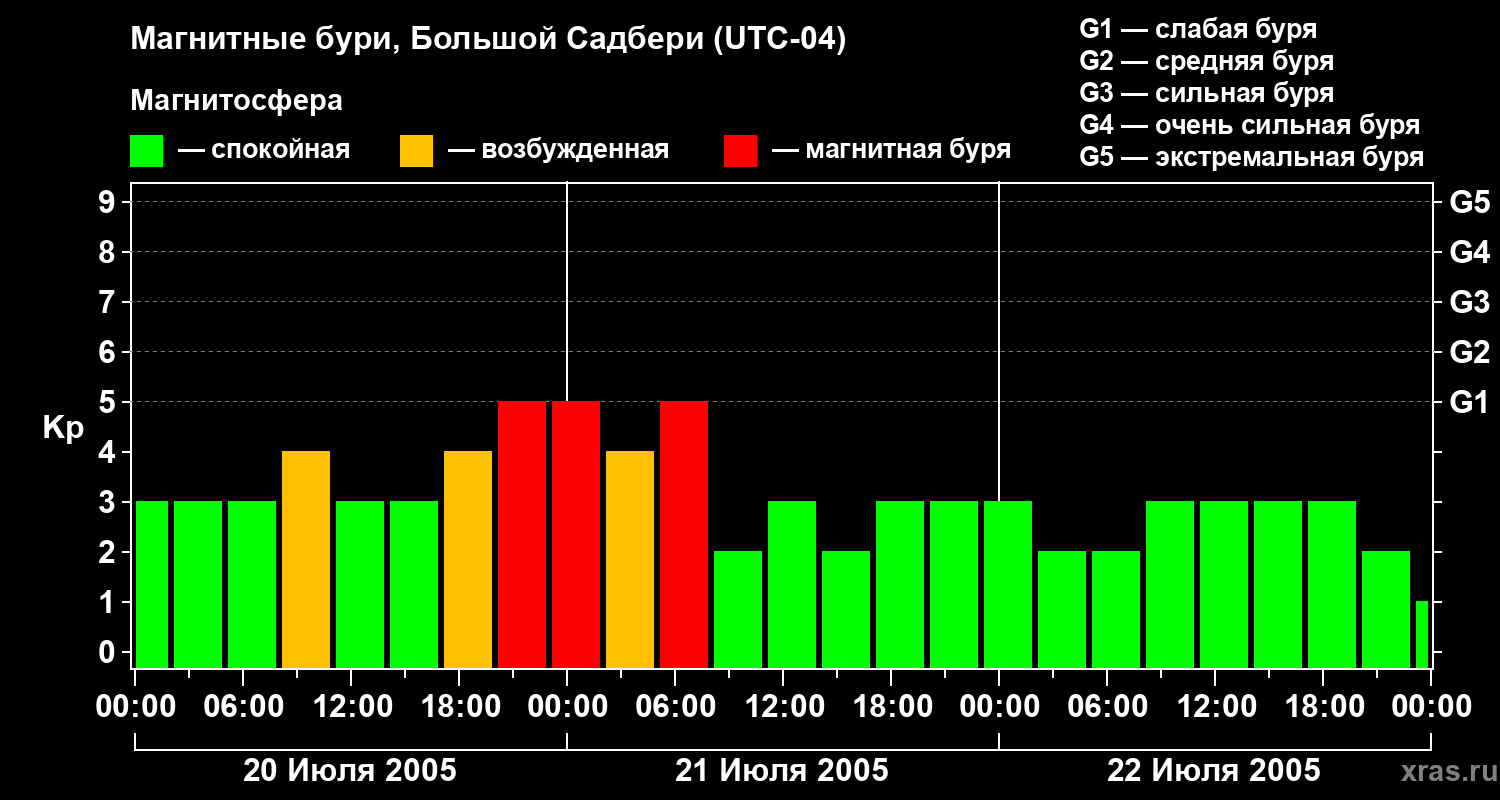 Изменения геомагнитного индекса Kp с 20 по 22 июля 2005 года для средних широт