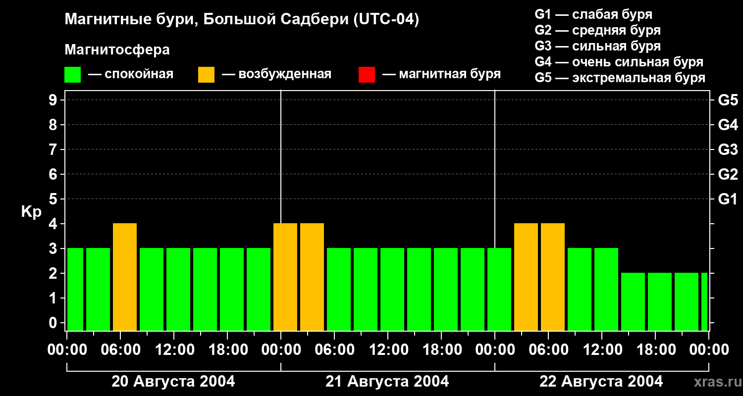 Изменения геомагнитного индекса Kp с 20 по 22 августа 2004 года для средних широт