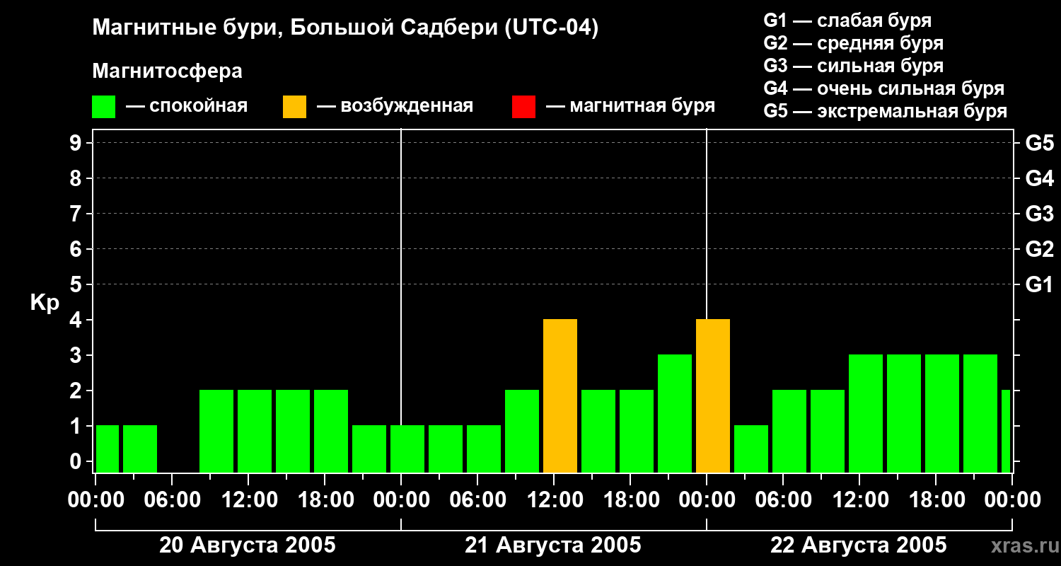 Изменения геомагнитного индекса Kp с 20 по 22 августа 2005 года для средних широт