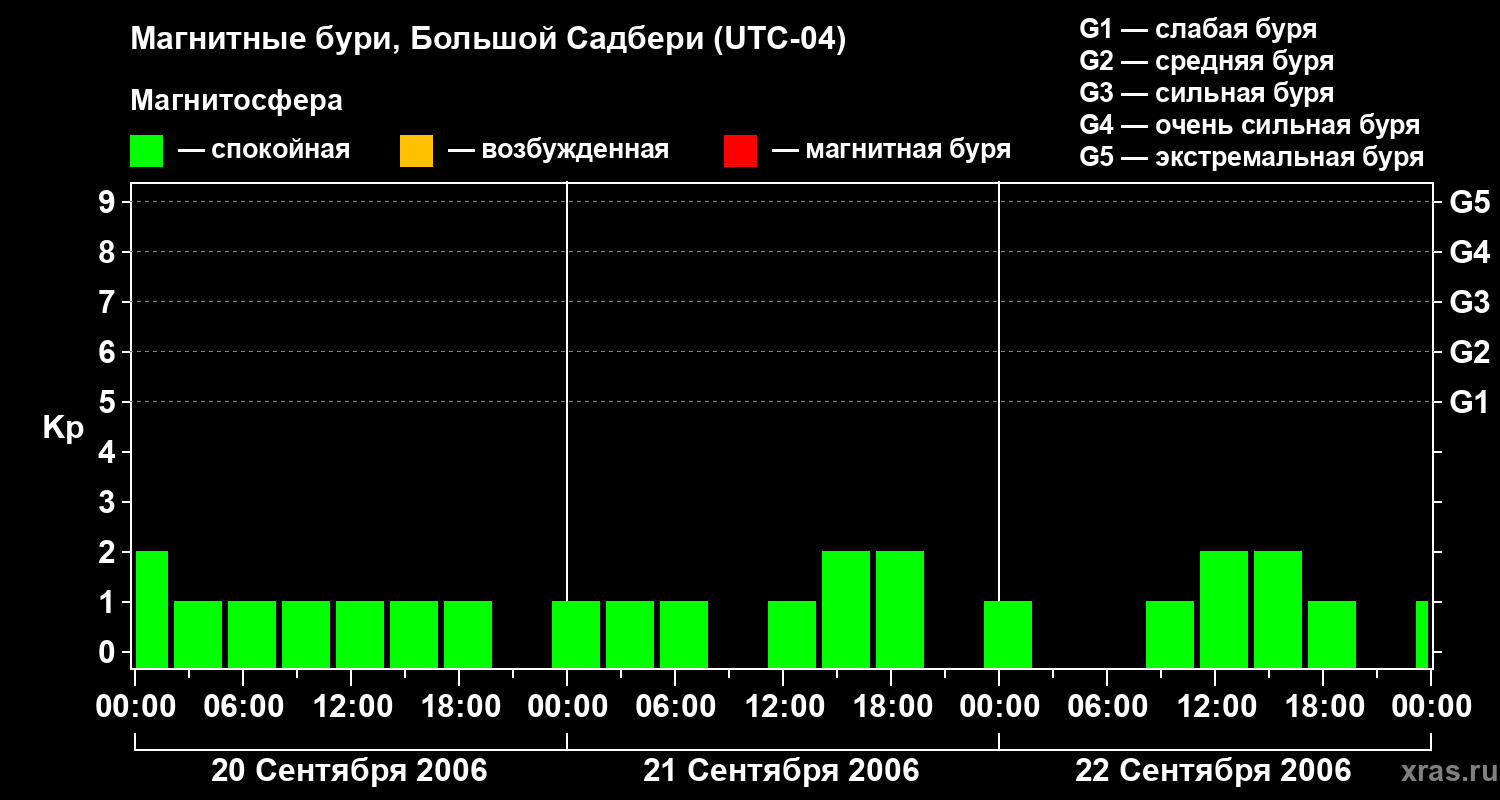 Изменения геомагнитного индекса Kp с 20 по 22 сентября 2006 года для средних широт