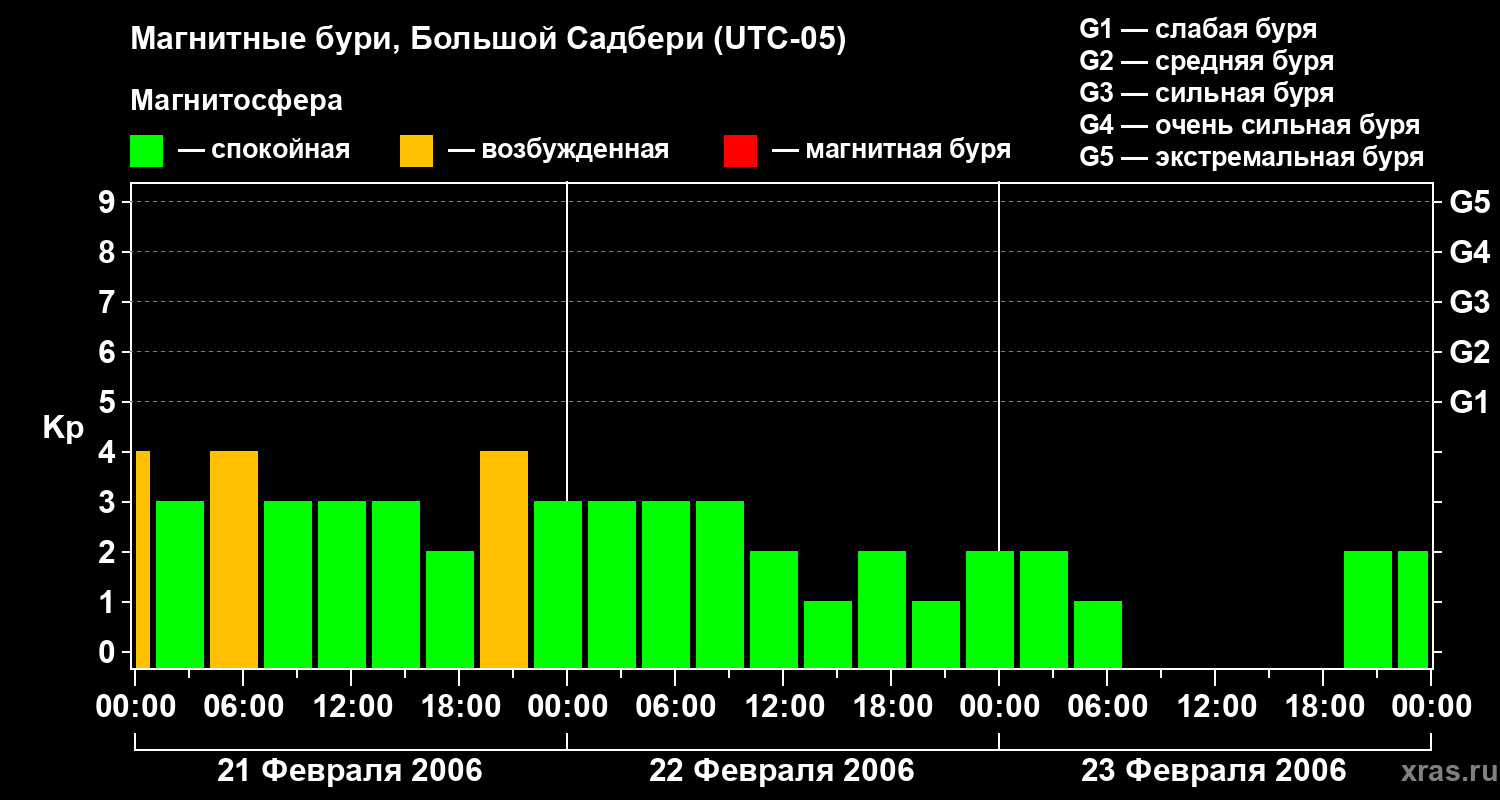 Изменения геомагнитного индекса Kp с 21 по 23 февраля 2006 года для средних широт