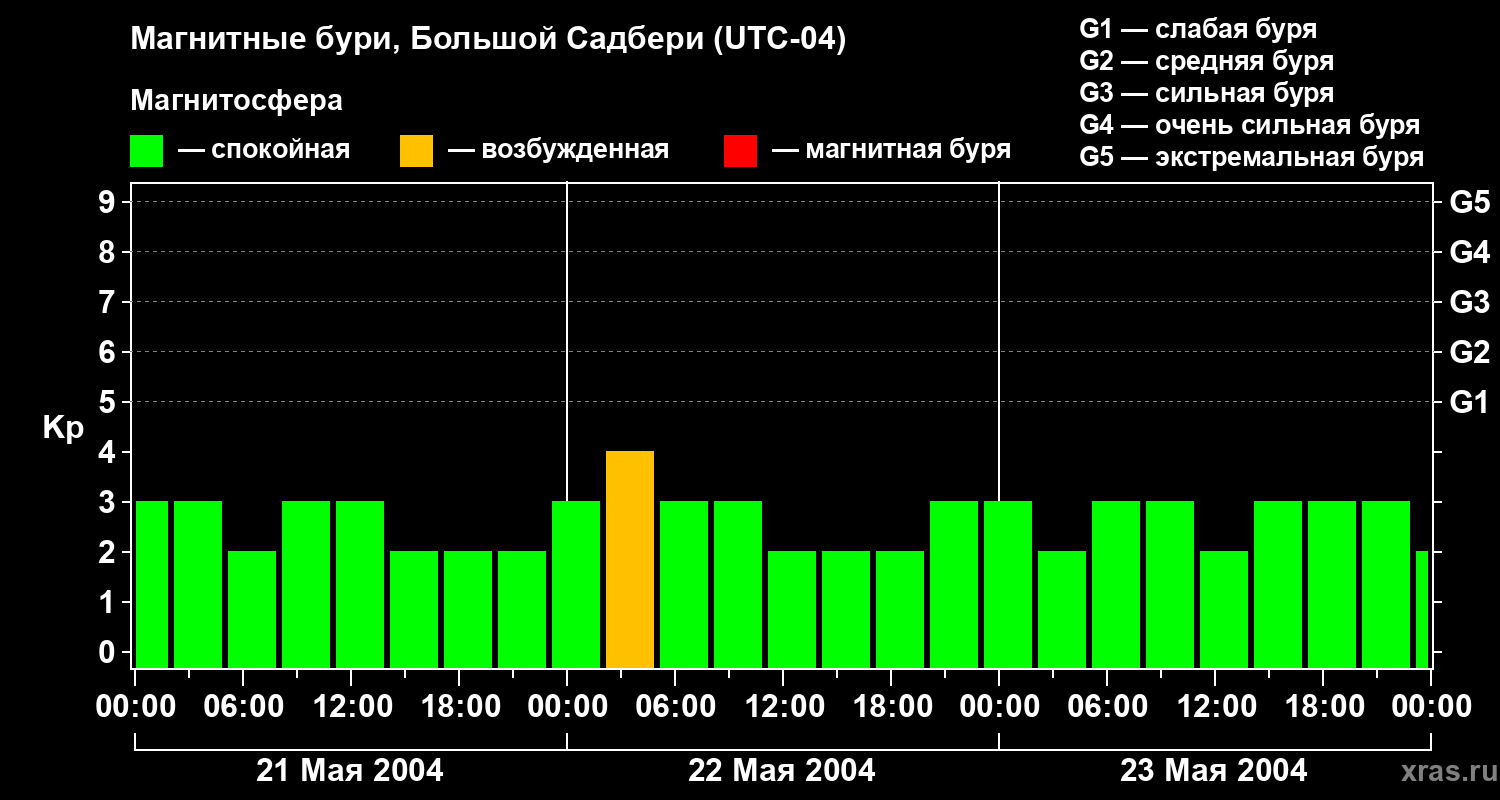 Изменения геомагнитного индекса Kp с 21 по 23 мая 2004 года для средних широт